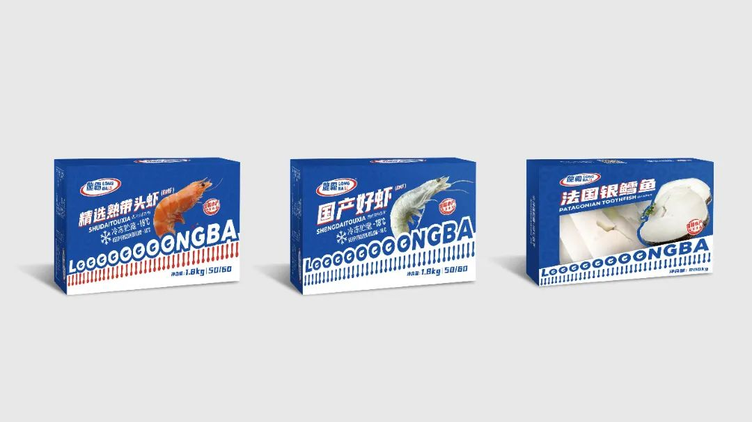 新LOGO色調上采用紅藍結合,藍色代表海洋,讓人輕松聯想到龍霸專注經營“水產食材”這一領域,紅色為品牌增加鮮活力量,在視覺上與傳統水產品牌明顯區分開來。