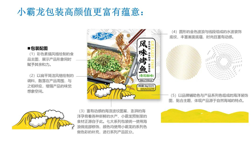 小霸龍升級后品牌定位為海鮮預制菜精選品牌,將聚焦預制菜產品,如風味烤魚、調味小龍蝦、水晶蝦餃等,擁有7大系列預制菜。煥新品牌形象后,小霸龍用一個歡樂、鮮潮、充滿愛及生命力的形象面向新消費群體,走入大都市人群的忙碌生活中,以“打造消費者最親密的飯友”為品牌理念。